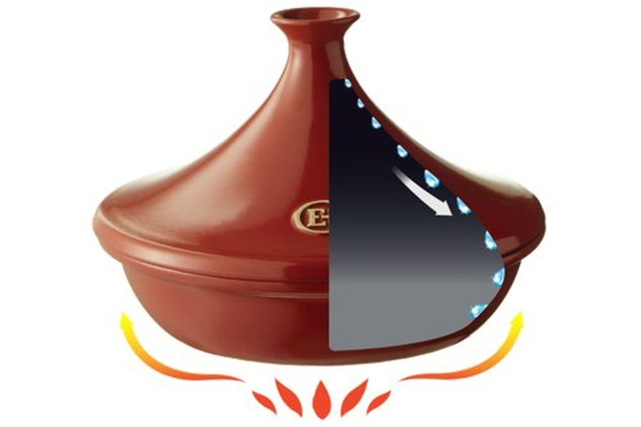 Zahvaljujoč stožčastemu, zaprtemu pokrovu med kuhanjem tagina kroži para, razvijejo se arome in poglobijo okusi.