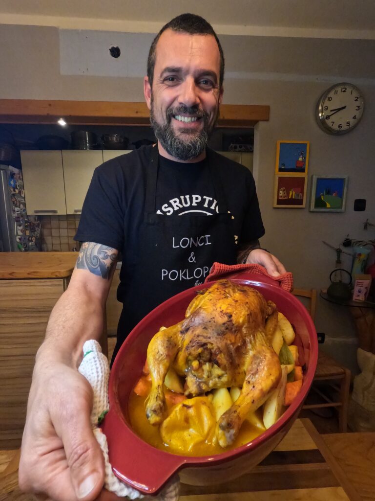Kokoško položimo na zelenjavo in krompir. Pokrijemo (ali zapremo z aluminijasto folijo) in pečemo v predhodno ogreti pečici na 200°C eno uro. (Če pečemo samo kokoško, lahko na dno pekača dodamo malo vode in belega vina). Po eni uri odstranite pokrov in pustite, da se peče še 30 minut.