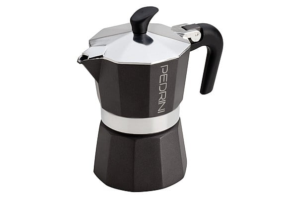 Črna kafetiera PEDRINI za 2 skodelice z emajliranim pokrovom, sledijo prvotni ideji priprave kave za vse strastne ljubitelje te edinstvene pijače. Material, iz katerega je izdelan, je aluminij, prevlečen s silicijem, ki daje aparatu za kavo visoko toplotno odpornost do 260 stopinj Celzija. Prihaja z nedrsečim, ergonomskim ročajem za trajnost do 210 stopinj Celzija. Ima trpežno silikonsko tesnilo. Certificiran varnostni ventil. Ni primeren za indukcijo. Ne pomivajte v pomivalnem stroju.