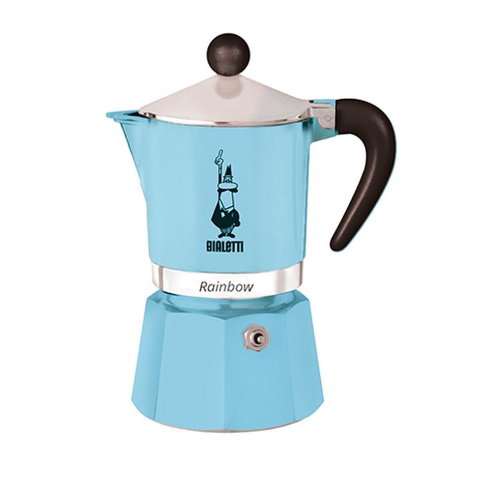 Svetlo modra kafetiera Rainbow BIALETTI primerena za 3 skodelice prvotne osmerokotne oblike, ki omogoča optimalno porazdelitev toplote in vitek videz, ki ga navdihuje žensko telo od prvega aparata za kavo Moka Express, ki je sprožil pravo revolucijo pri pripravi kave, niso bistveno spremenili. S klasičnim dizajnom, eleganco in tehnološko preprostostjo, a kljub temu visokokakovostnim in varnim, so kavni aparati s časom prišli do popolnosti. Ne glede na to, ali gre za klasični aluminij ali iz nerjavečega jekla, primernega za indukcijo, bo vsak pripravil vrhunsko moka kavo. Kavarne Bialetti bodo v nekaj minutah ustvarile bogat, verodostojni espresso.