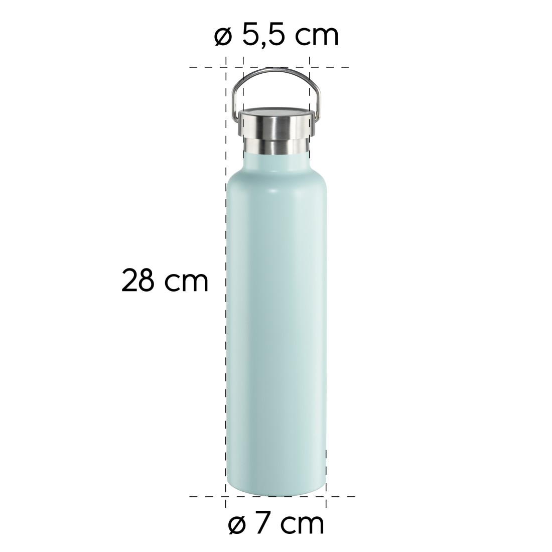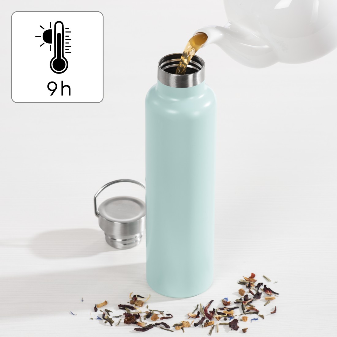 Termovka za večkratno uporabo, popolna za tople in hladne napitke na poti, za okusne in zdrave pijače v pisarni, na odmorih in ko ste zunaj. Izolirana steklenica za tople napitke, uživajte v kavi, čaju in kuhanem vinu na poti in se ogrejte. Z dvojno izolacijo ostanejo topli napitki vroči približno 9 ur, hladni napitki pa približno 12 ur. Navojni pokrovček tesno zapre izolirano steklenico in ga je enostavno odpreti in zapreti. Primerno tudi za gazirane pijače. Enostavno polnjenje, odstranite pokrov, napolnite s kavo, mlekom, sladkorjem, ledenimi kockami ali sadjem. Odporen na sadne kisline in varen za hrano, material ne pušča nobenih arom. Lahko nerjaveče jeklo, popolno za premikanje. Zahvaljujoč dolgotrajnim in robustnim materialom se lahko uporablja več let.